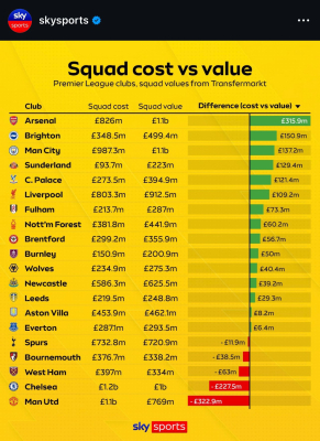The Mancunians, worst of the lot, with £1.1 billion spent but only a £769m squad value, show a deficit of £322.9 million, the worst in the league, or anywhere in the world.